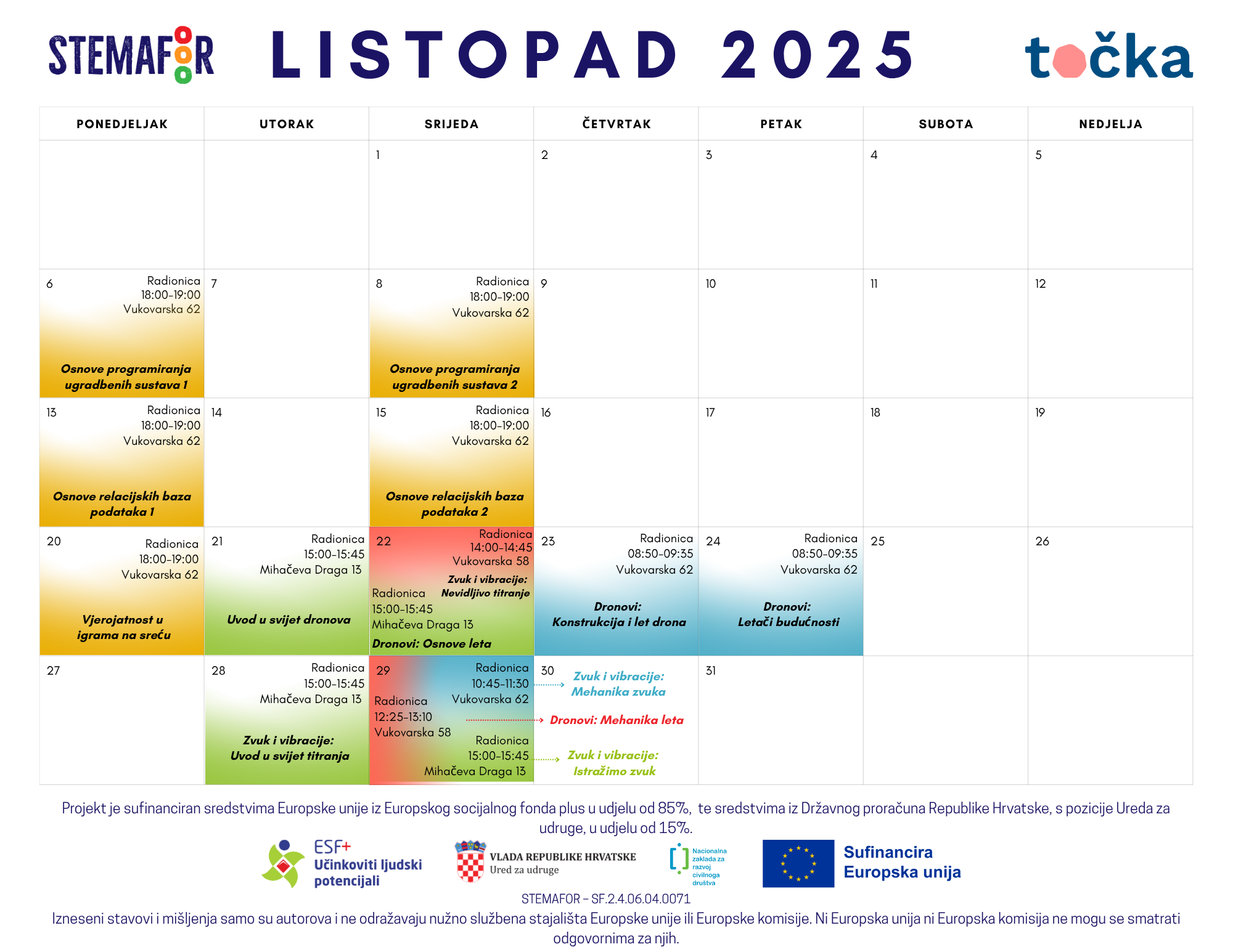 Nakon mnogobrojnih ljetnih radionica i STEM sadržaja tijekom ljeta, Udruga Točka je ove jeseni nastavila s nizom aktivnosti u sklopu projekta STEMAFOR – SF.2.4.06.04.0071 sufinanciranog sredstvima Europske unije iz Europskog socijalnog fonda plus te sredstvima iz Državnog proračuna Republike Hrvatske.